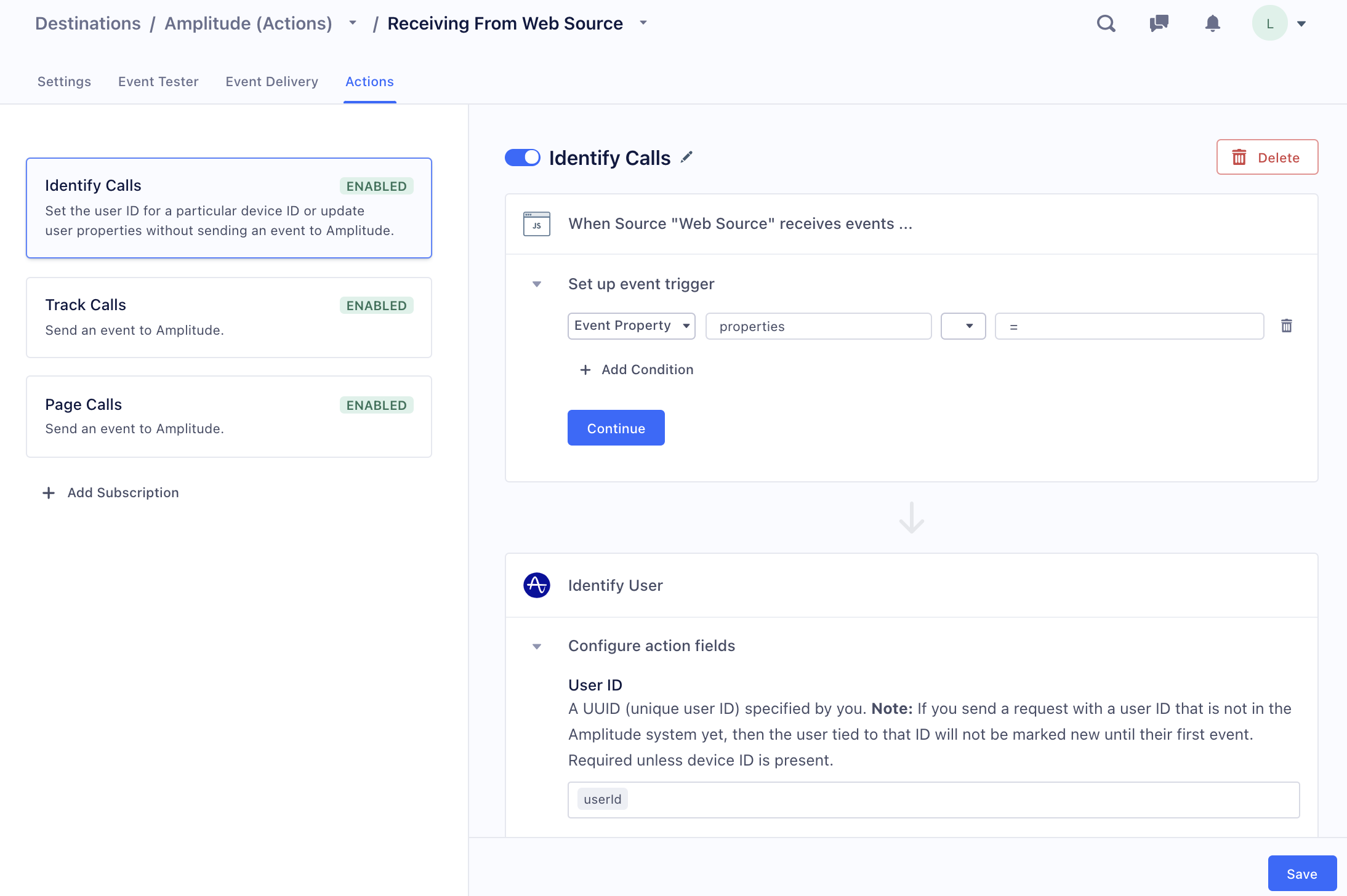 For example, in the Amplitude (Actions) destination, you define your API and Secret keys in the destination’s global settings. Then, the provided Page Calls subscription: