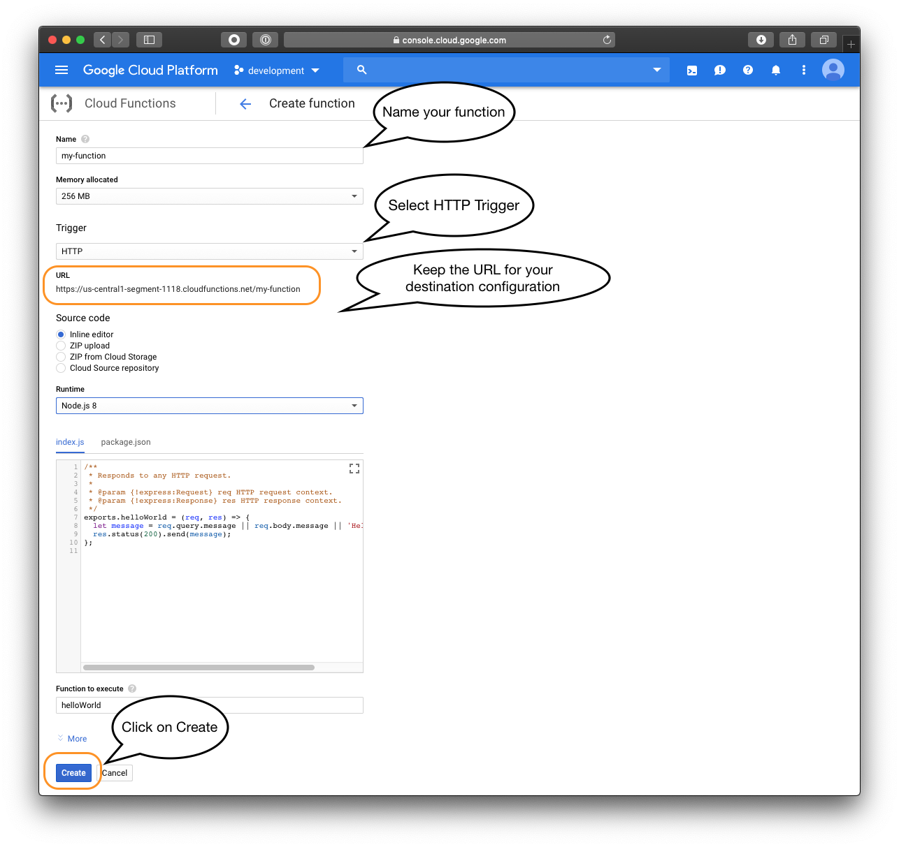 Before you can process events from Segment, you must provide a Google Cloud Function that can handle your incoming events.