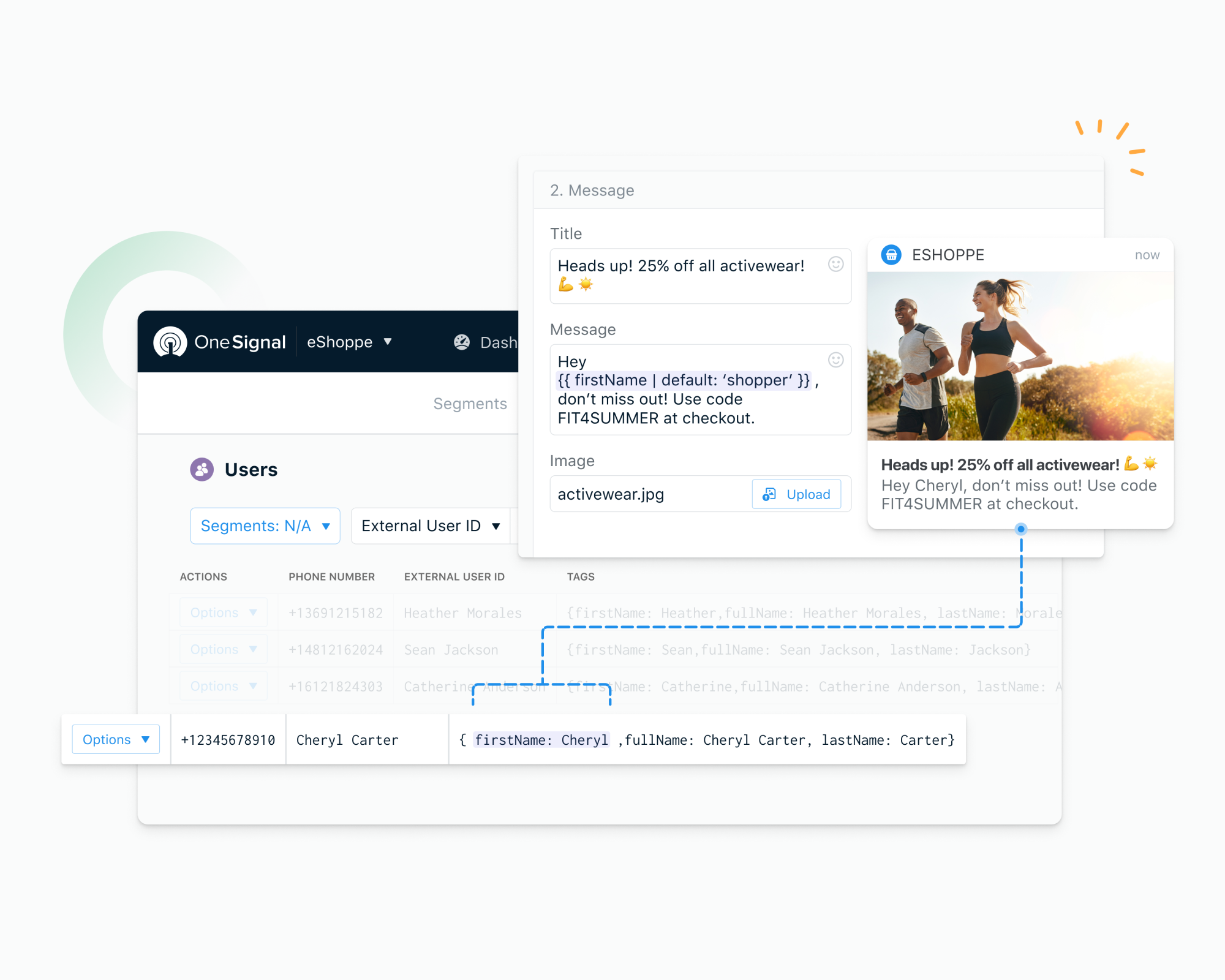 emailandphoneproperties. To updateemailandphoneproperties in OneSignal, create a player record with the email address and/or a phone number and map those records with the External_User_ID. Additional properties from Segment map across all your matching records, including email and phone number records.
