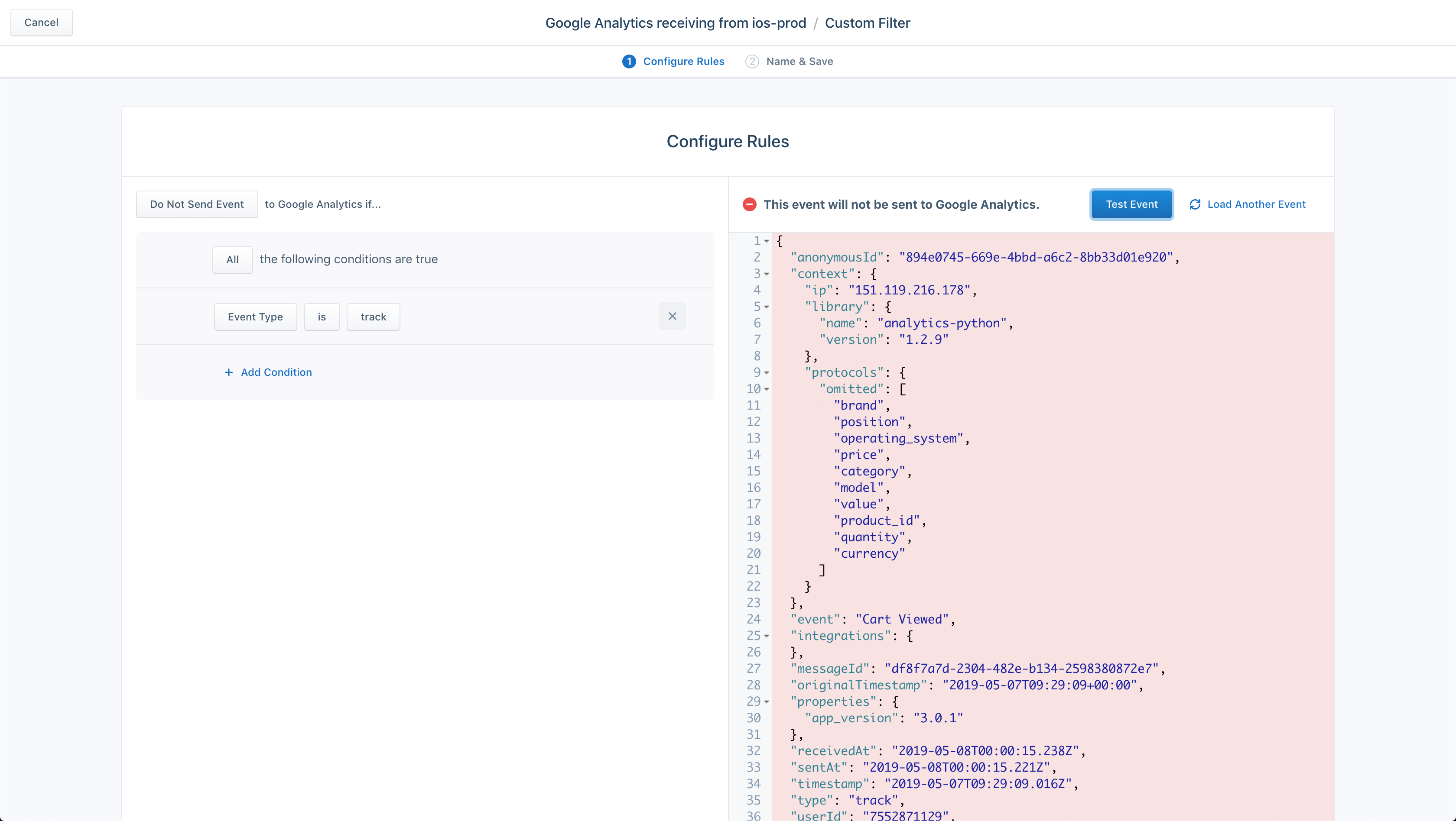 Example: Don’t send events when the Order Completed and properties.email contain @segment.com.