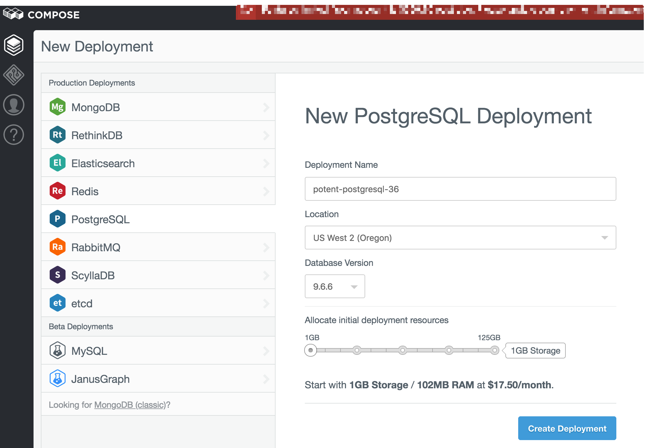 For those of you already on Compose, if don’t yet have a PostgreSQL instance, you can add one from the Deployments page in the management console by clicking “Create Deployment” then selecting PostgreSQL or just add a PostgreSQL deployment to your account.