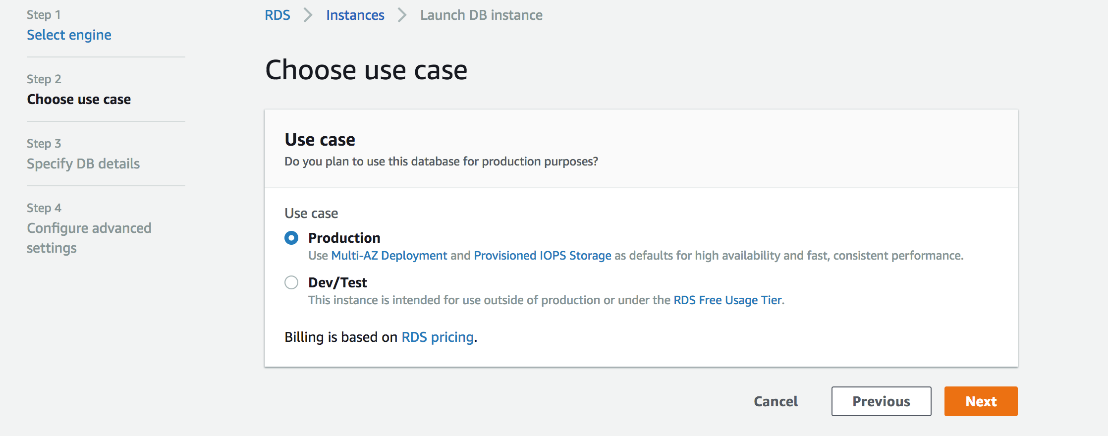 If you anticipate high utilization on your Postgres database, or if downtime is unacceptable, choose Production. If you don’t plan to have high-utilization of your database or periods of downtime are acceptable and you know how to recover from them, choose Dev/Test.
