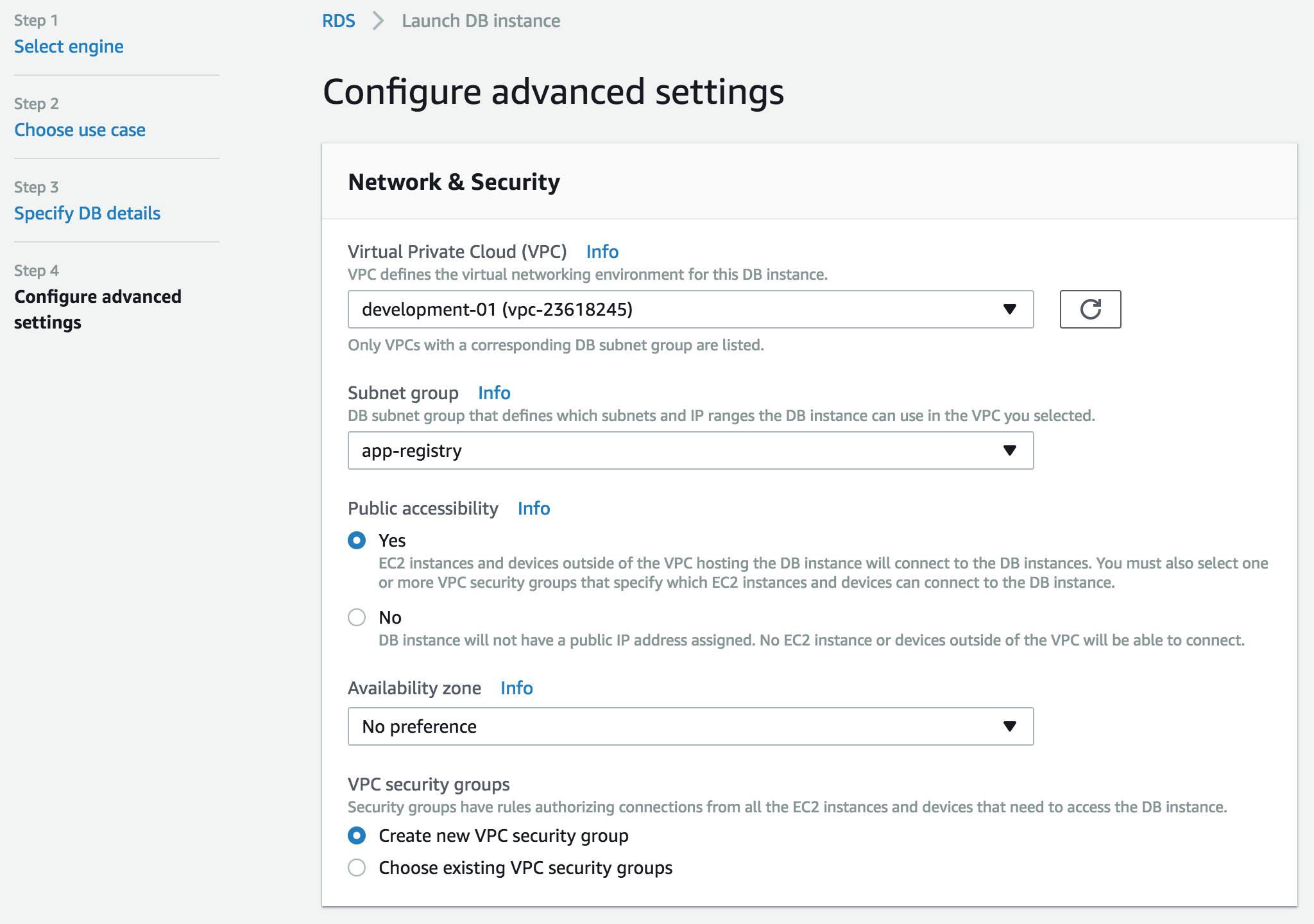 - DB Parameter Group specifies the configuration applied to the database. If you haven’t created a custom parameter group that you want to use, choosing the default is fine.