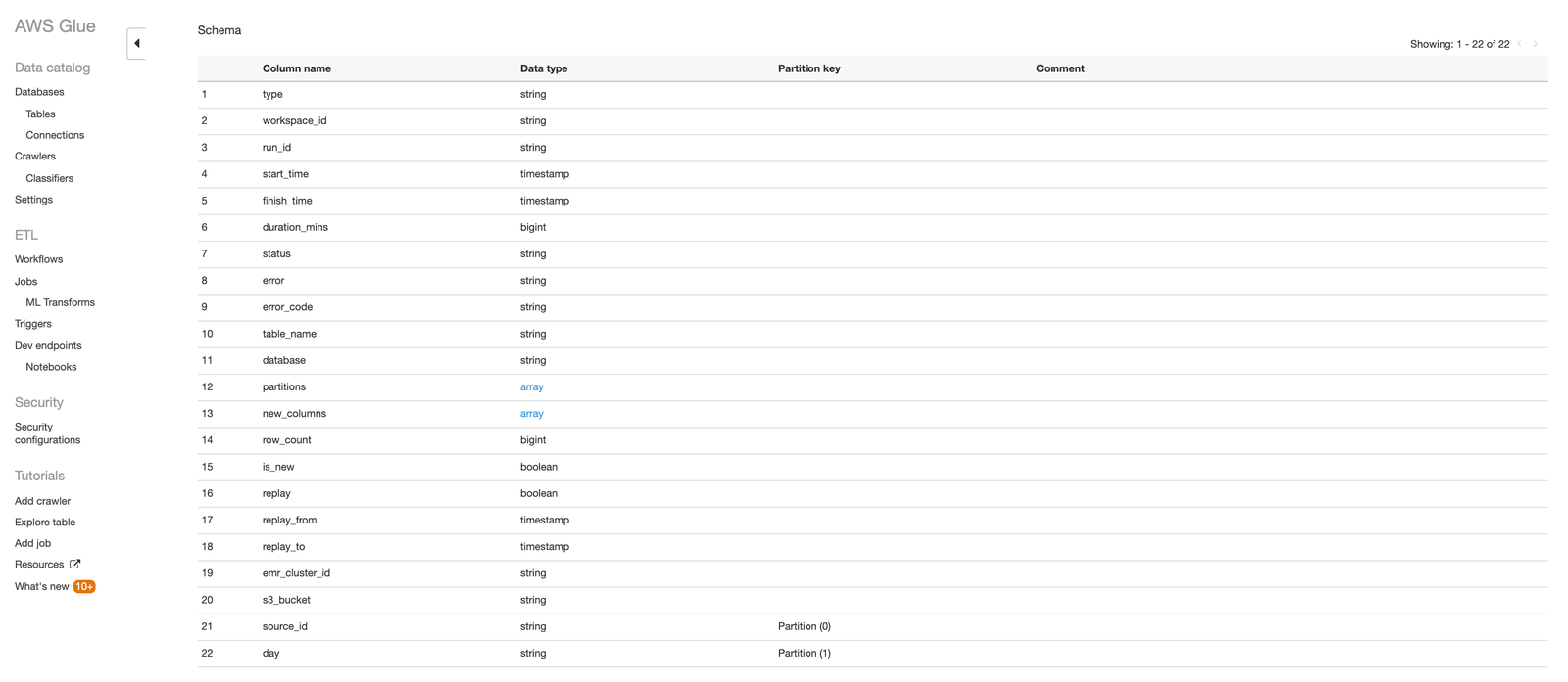 The Glue Database named __segment_datalake stores the schema of the sync_reports table. The schema looks like: