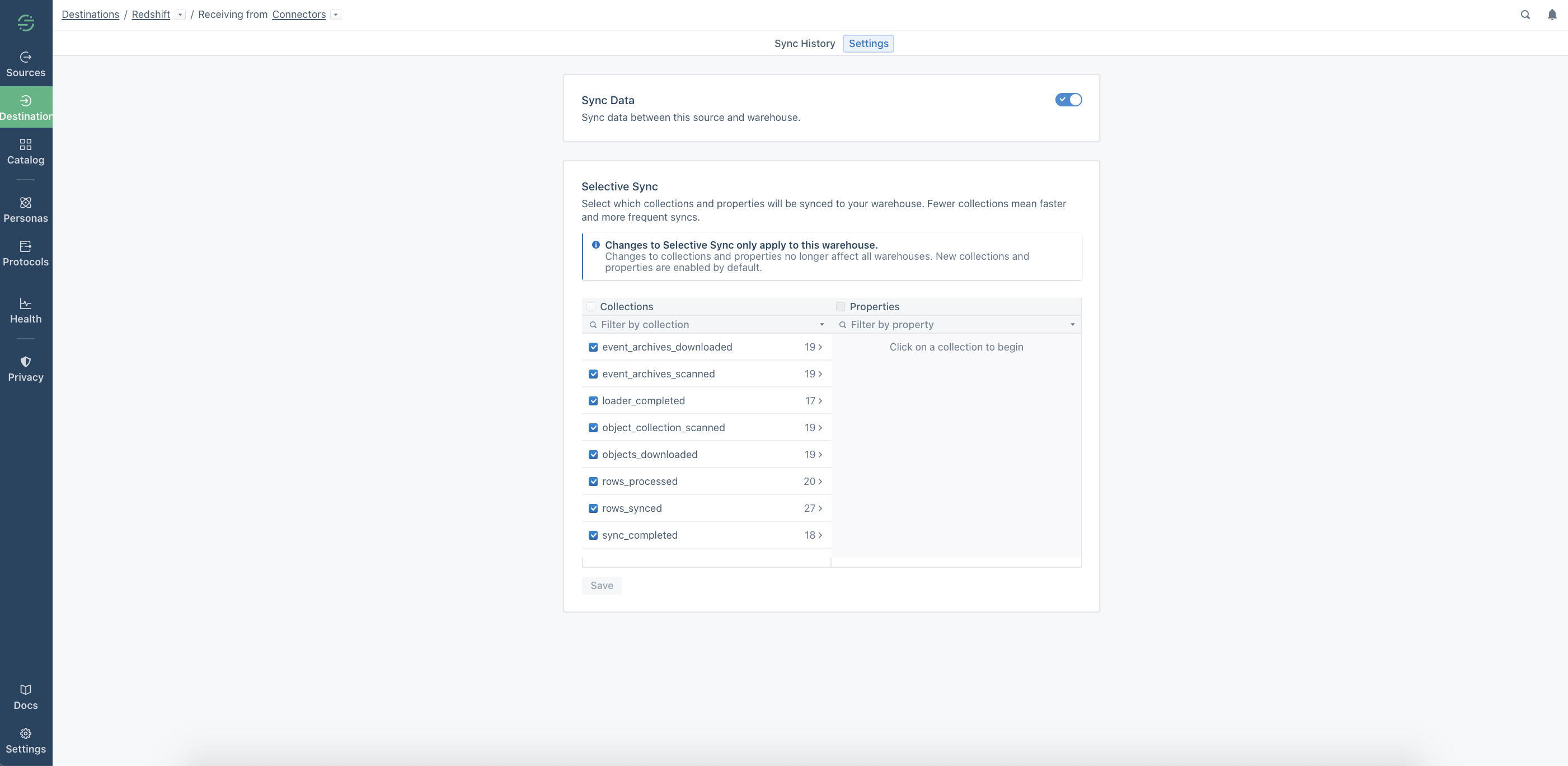 Warehouse Selective Sync allows you to manage the data that you send to your warehouses. You can use this feature to stop syncing specific events (also known as collections) or properties that aren’t relevant, and could be slowing down your warehouse syncs.