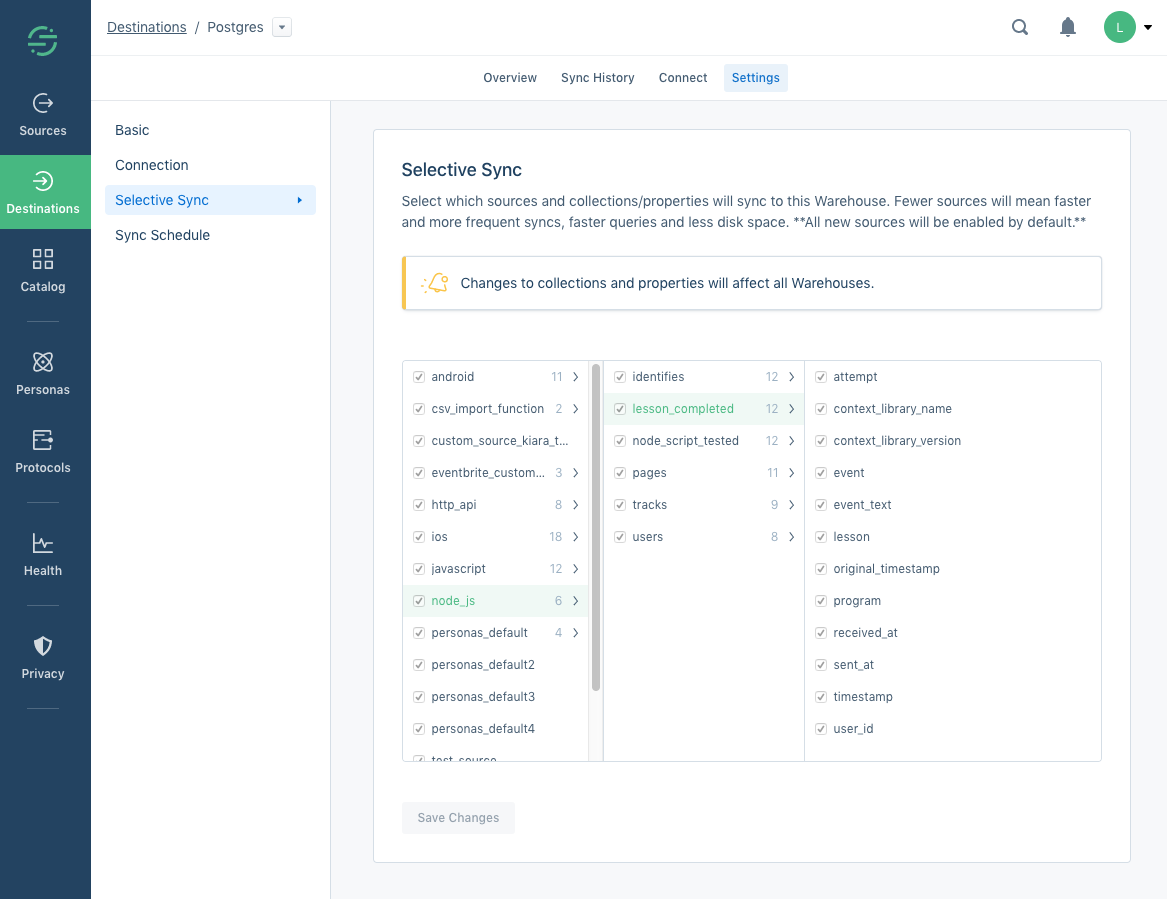 By default, a warehouse receives all sources and their collections and properties. No data is prevented from reaching warehouses. With Selective Sync, you can configure which collections and properties from a source are sent to each warehouse. This allows you to send different sets of data to each warehouse. This also means that you need to enable or disable data for each individual warehouse.