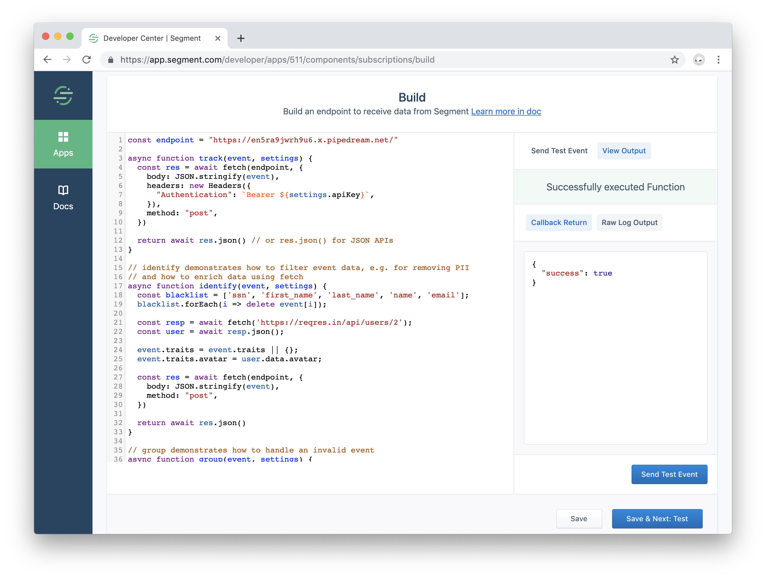 Next you can click the “Event Tester” tab to send data to your destination. Here you can see what requests Segment sends to your destination and introspect the response you are returning. Learn more about the event tester here.