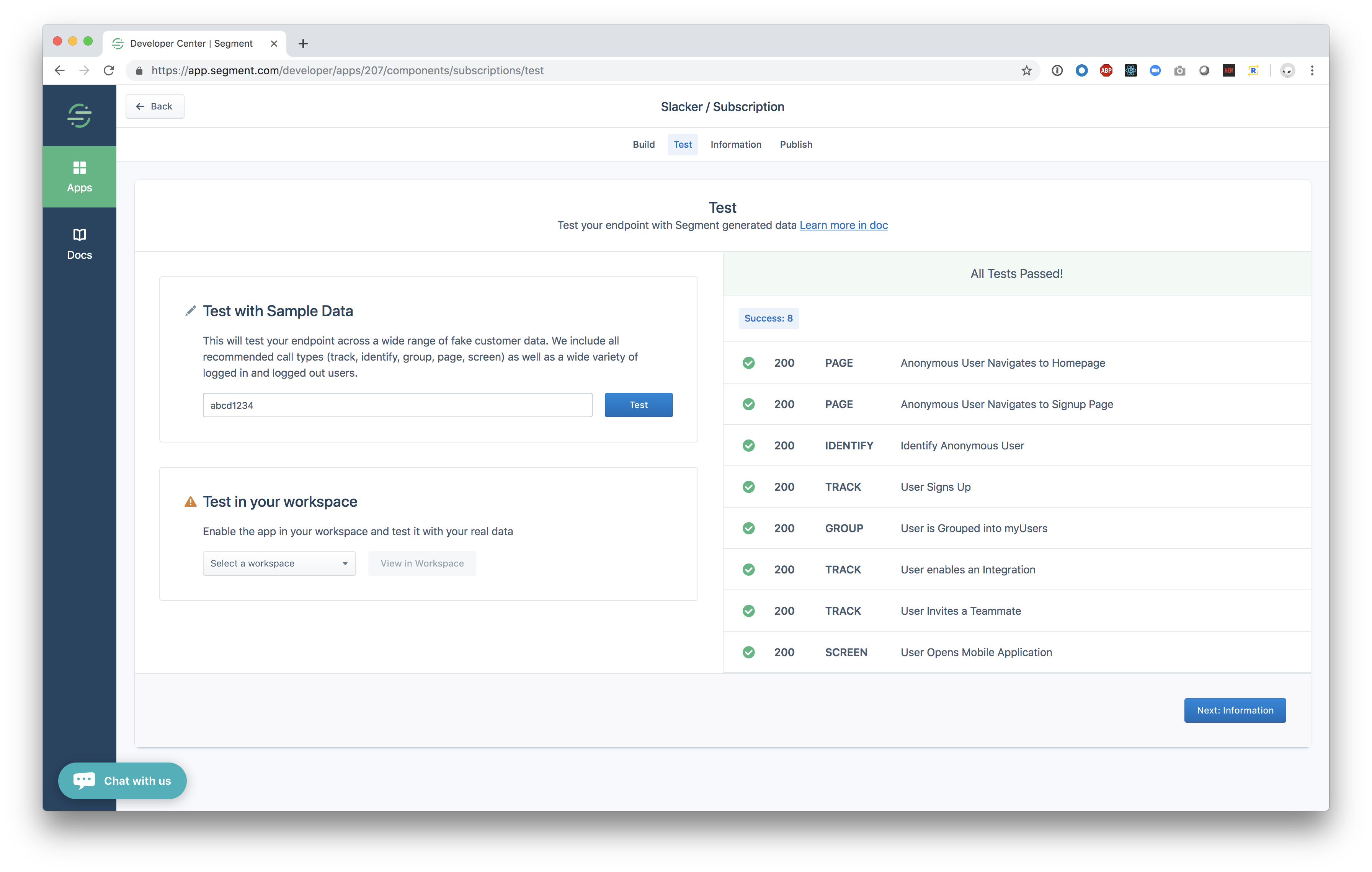 When your code is working with one event you can test it with a suite of more Segment events. Click Save and Next: Test, fill in an API Key and click Test. You will see the results of additional types of Segment data.