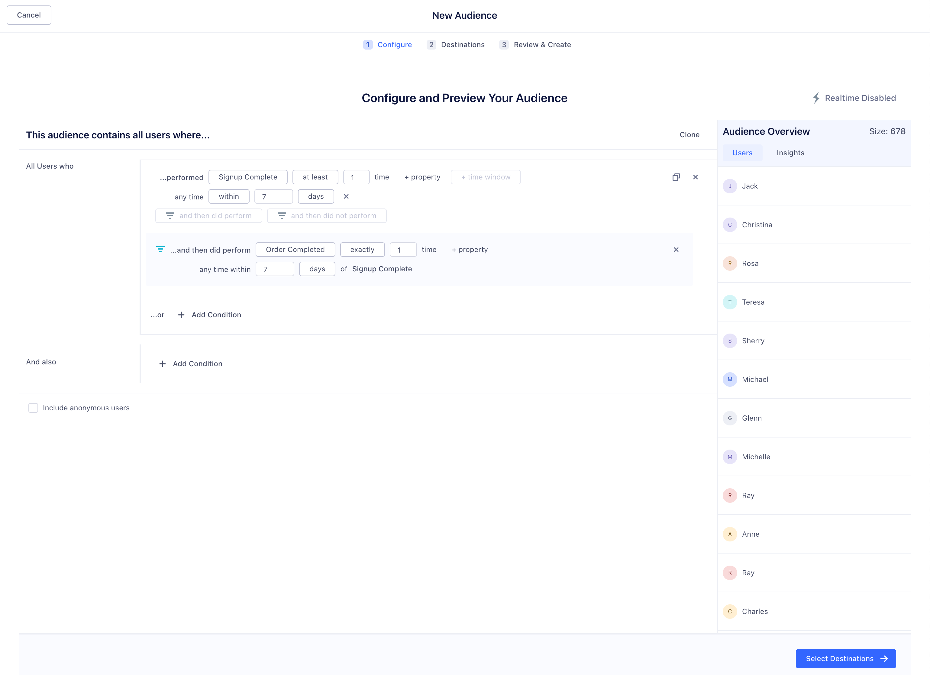 An Audience is a list of either users (B2C), or accounts (B2B), who match a specific criteria. An example of a basic Audience that Segment’s Marketing team might build is an “active sign ups” audience for an email marketing campaign. This Audience is contains all users who signed up in the last seven days, and who also added a source within 7 days of signing up. The example below shows how you could define this audience in the Audience Builder.