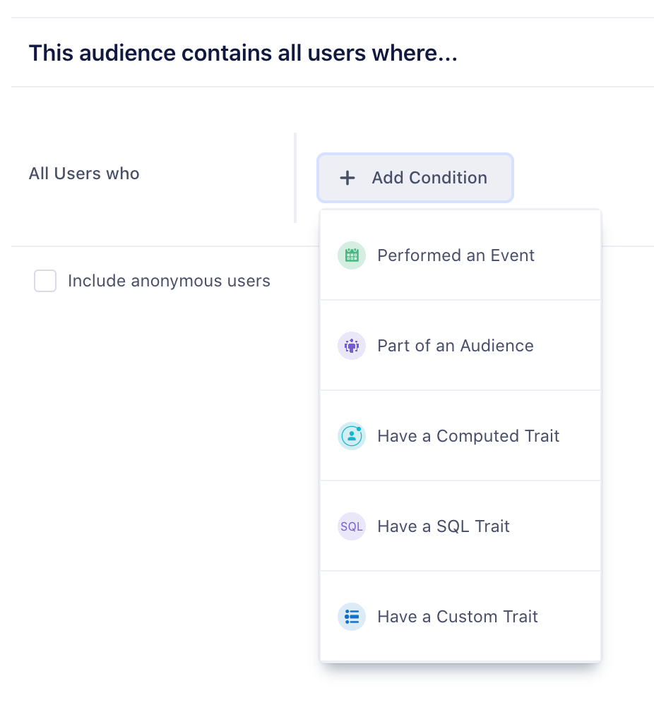 When building an audience you can use existing events, traits, computed traits or audiences.