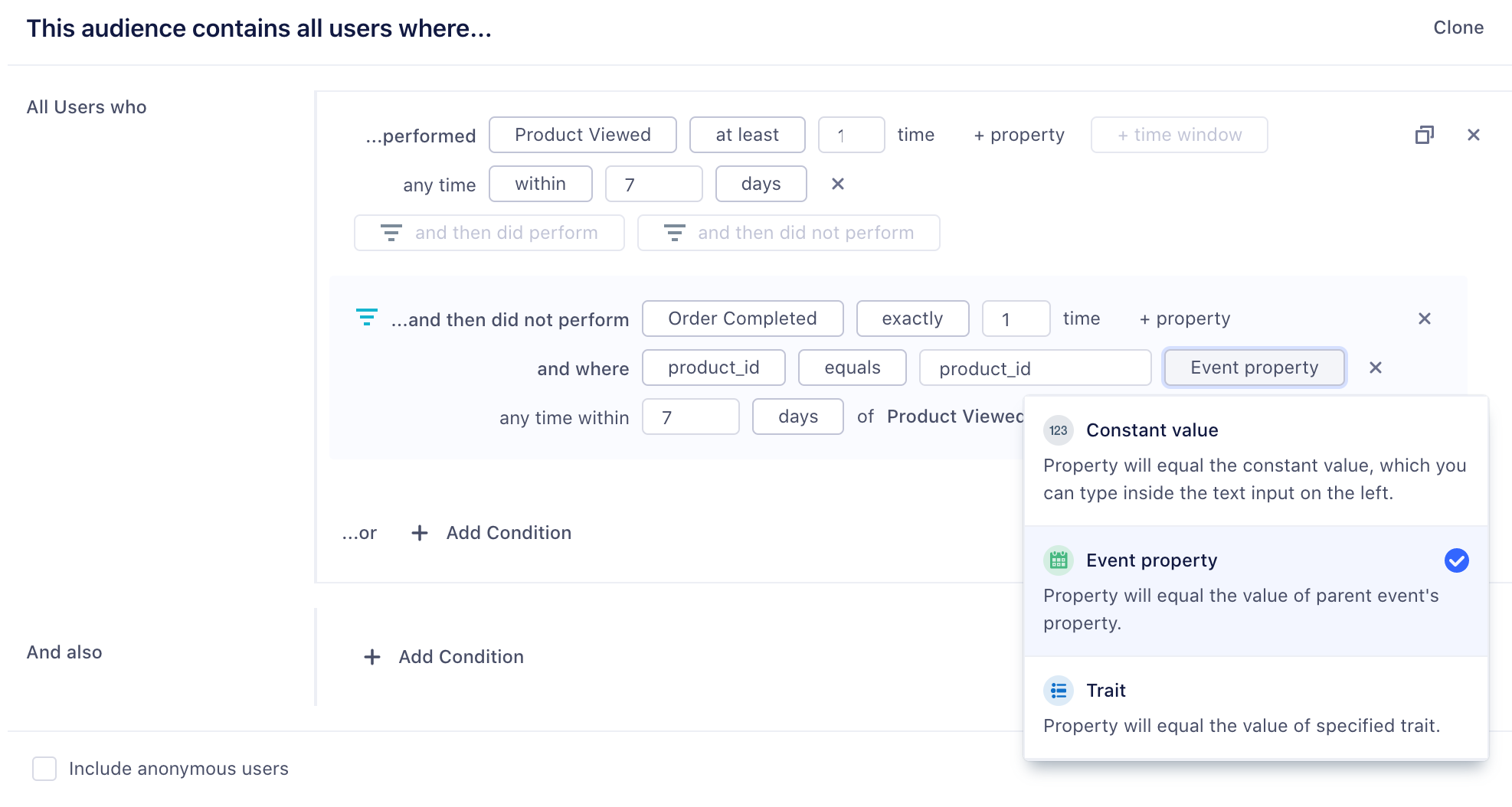 Dynamic Property references give you more flexibility over funnel audiences. Instead of specifying a constant value in both events, like product_id = ‘123’ for both Product Viewed and Order Completed events, you can specify that a child event references an event property of a parent event. You can also compare an event property to a trait variable.