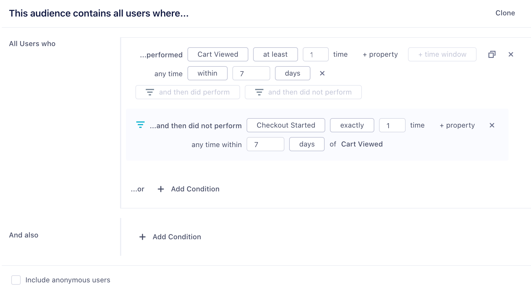 You can build an audience from any of the events that are connected to Personas. This includes any track, page, or screen calls. You can use the property button to refine the audience on specific event properties as well. Select and not who to indicate users that have not performed an event. For example, you might want to look at all users that have viewed a product above a certain price point, but not completed the order.