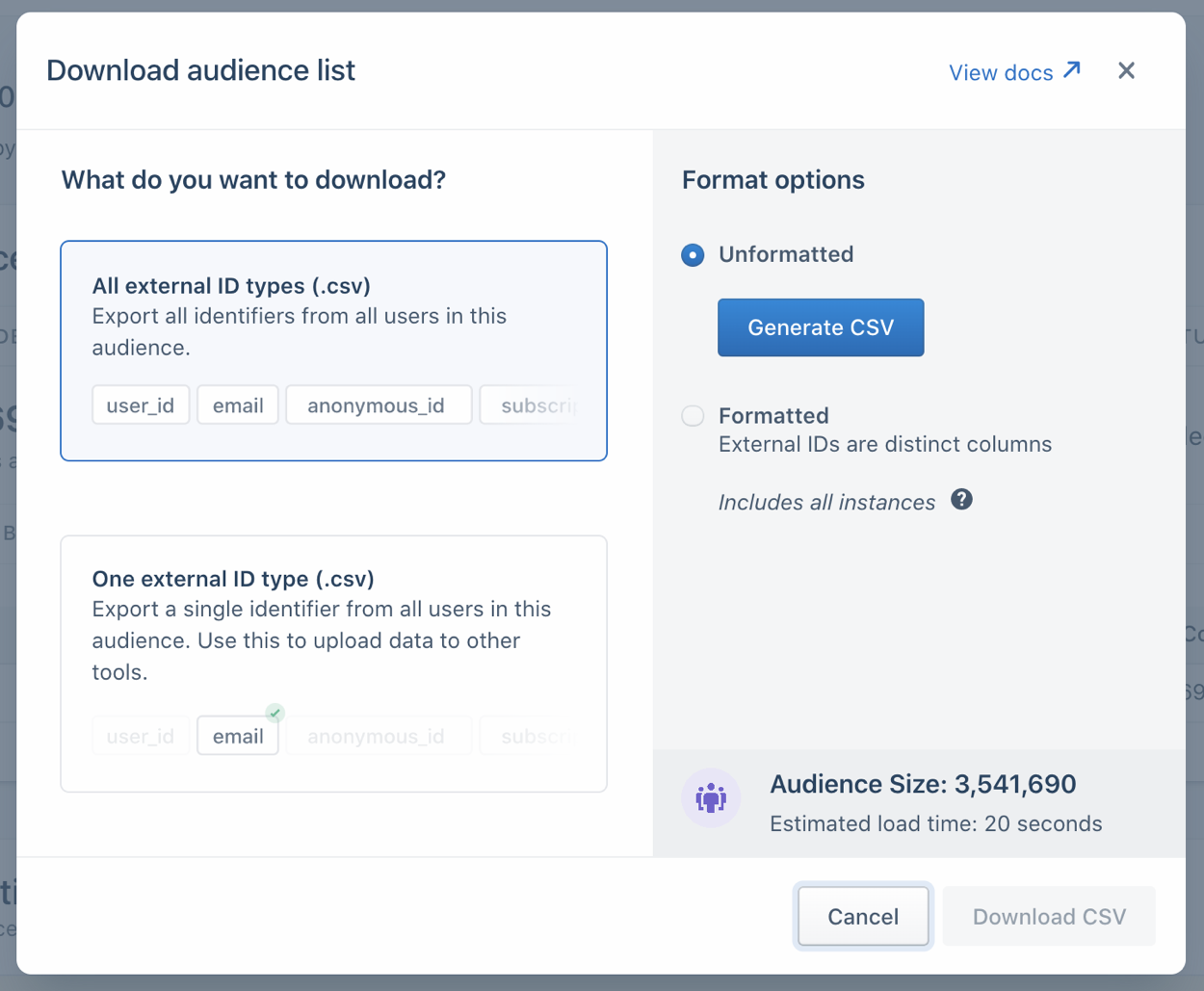 Generating a CSV can take a substantial amount of time for large audiences (around 30 seconds for a formatted CSV with 1 million rows). For CSVs that are expected to take over 20 seconds, the Segment app displays an estimated generation time. After clicking Generate, it is recommended that you leave the modal open while the CSV is created. (If the audience recalculates between when you click Generate and when you download the file, you might want to regenerate the file. The CSV is a snapshot from when you clicked Generate, and could be outdated.) |
