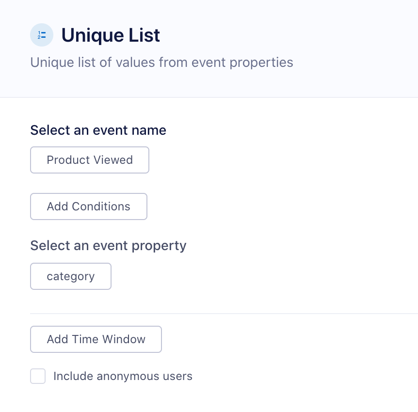 Unique list computed traits will output a list of unique values for an event property. This is helpful to understand the different types of products or content that a customer or users in an account have interacted with or purchased. Customers are creating traits like unique_product_categories_viewed and sending them to email marketing tools and accessing them through the Profiles API for in-app personalization.