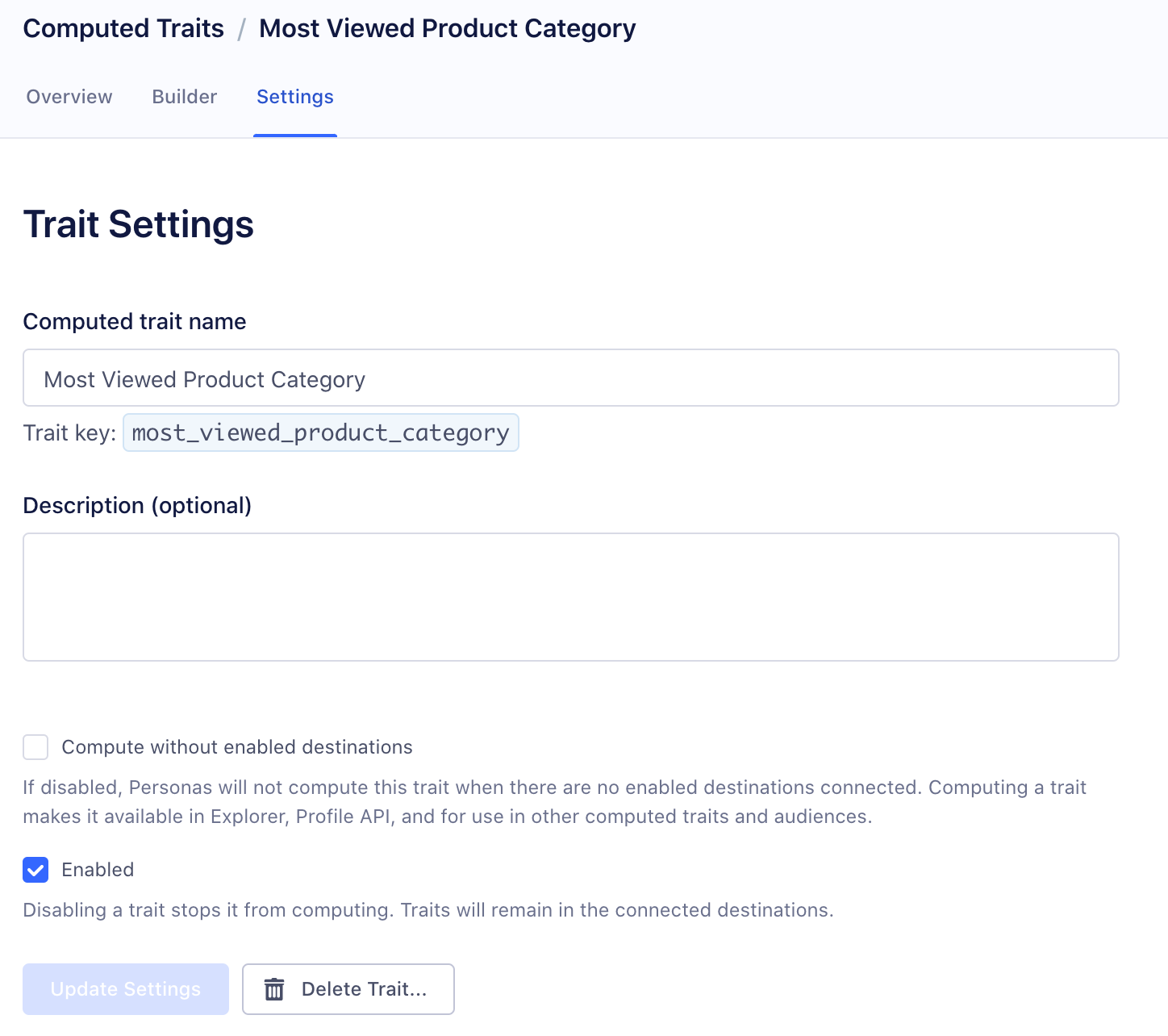 Personas sends user-level computed Traits to destinations using the Identify call for user traits, or using the Track call for event properties. Learn more about Computed trait generated events here. The trait name corresponds to the snake cased name that you see in the trait settings, for example most_viewed_page_category. See the list of Personas-compatible destinations