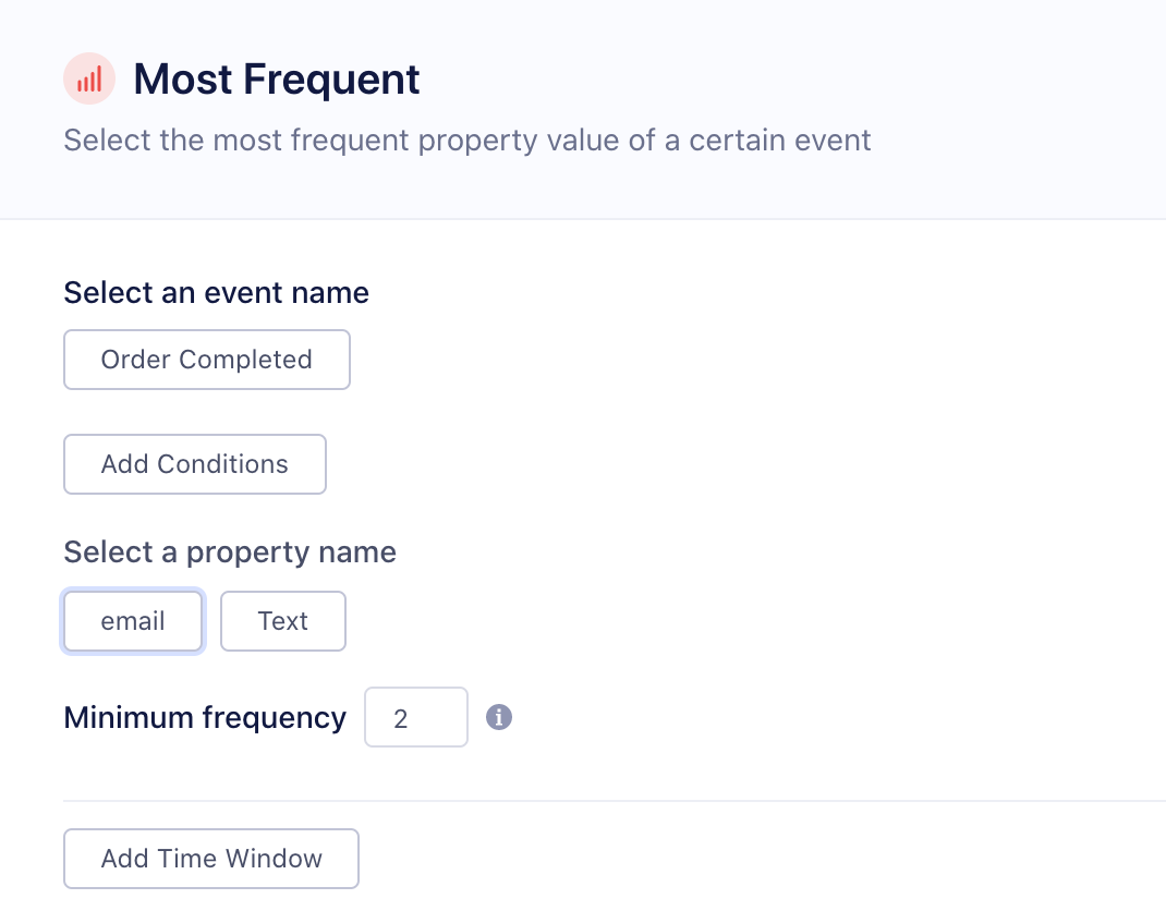 A most frequent user-level computed trait will return the most common value for an event property. This is helpful to create traits like preferred_product_viewed or most_commonly_viewed_category that tell you what a user’s preferred product, or content category might be. Note that the most frequent computed trait requires the event property to have been tracked at least twice. In the case of a tie, we return the first alphabetical value. For account-level computed traits, you can also return the most frequent user trait. This is helpful when you want to determine which user has performed an event the most frequently. For example, you might to return the email of the user in an account most actively viewing your app.