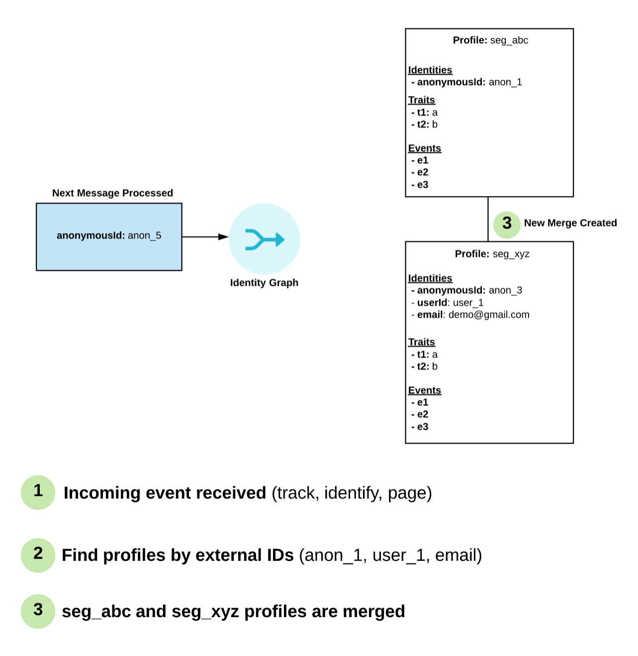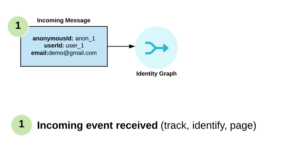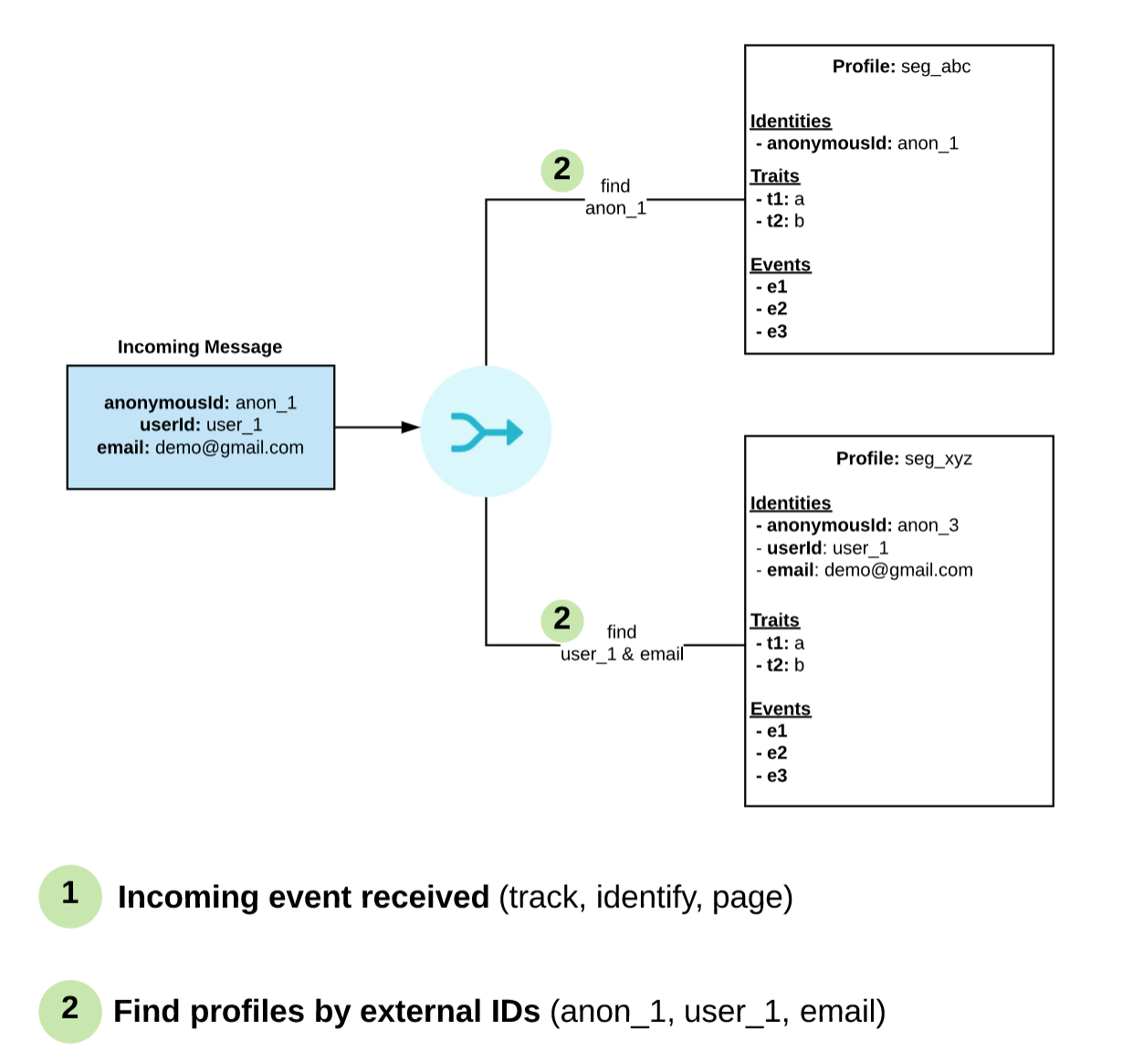 Each incoming event is analyzed and external IDs are extracted (user_id, anonymous_id, email). The simplified algorithm works as follows: