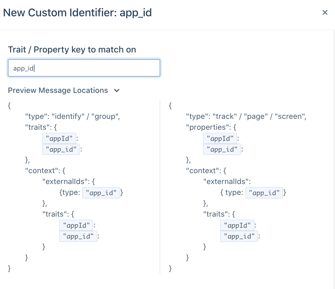 You can also provide a trait or property key to match on to add custom identifiers. You can preview the locations where Segment looks for the identifier. Segment accepts both camelCase and snake_case for context.traits, traits and properties, but accepts lowercase types for identifiers only in the context.externalIds object.