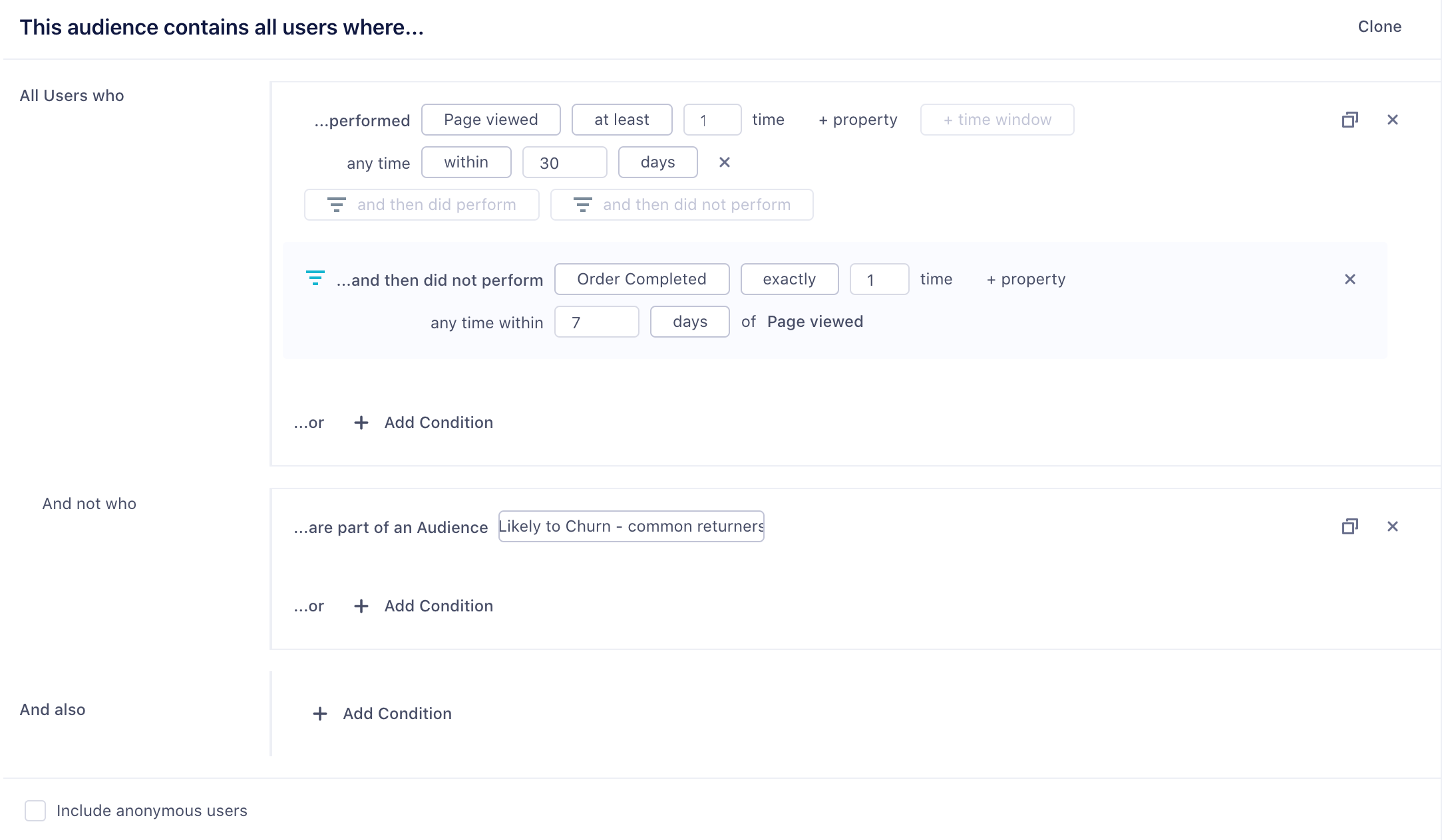 - Optionally, add more conditions until you’re satisfied that the audience will only contain the users you want to target.
