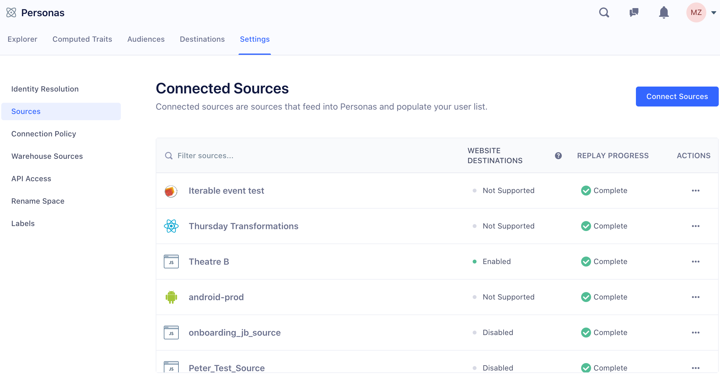 Once you select sources, Segment starts a replay of one month of historical data from these sources into your Personas space. We’re doing this step first so you have some user data in Personas to build your first audiences and computed traits.