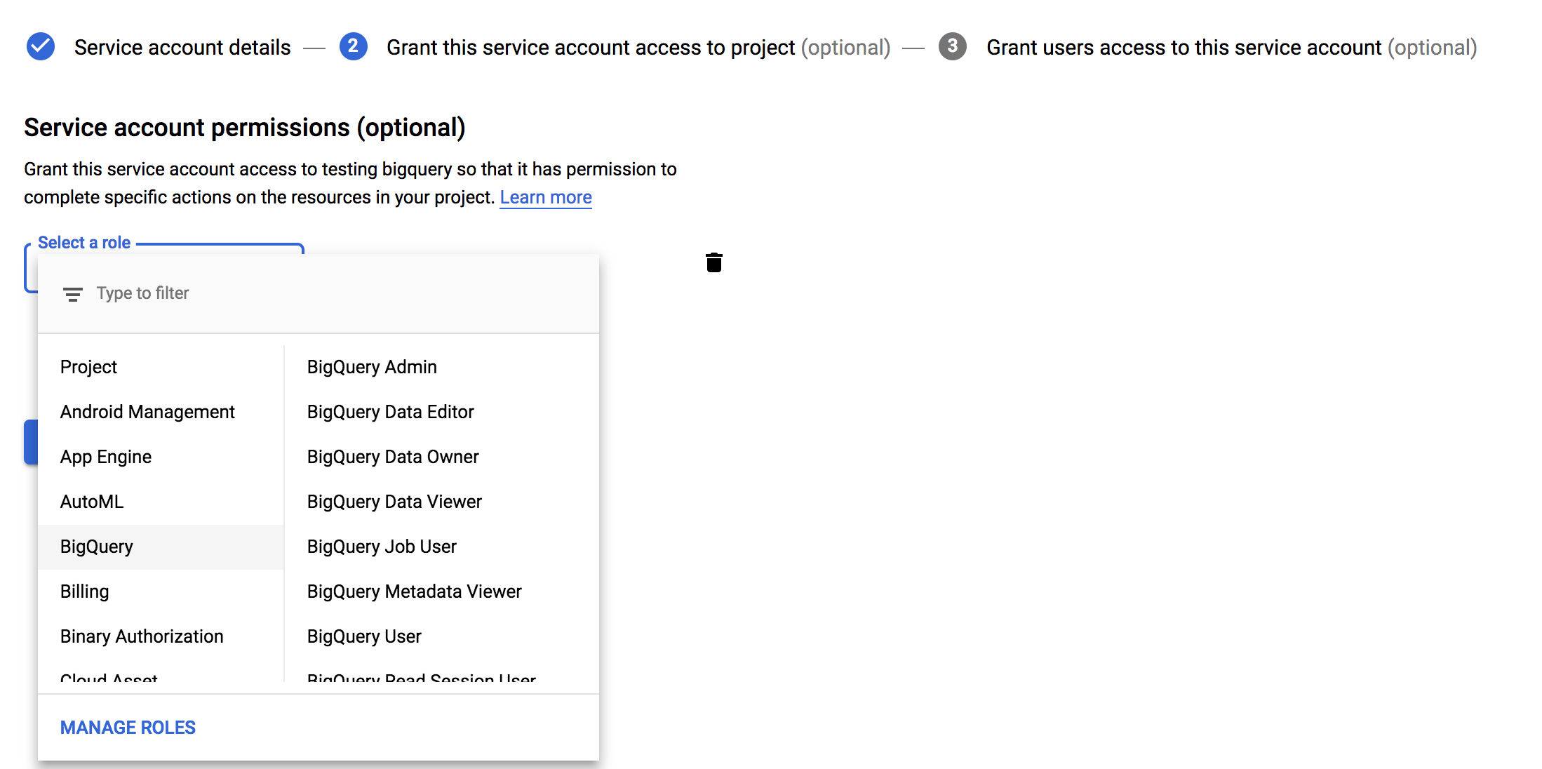 IMPORTANT: Do not add any other roles to the service account. Adding other roles can prevent Segment from connecting to the account.