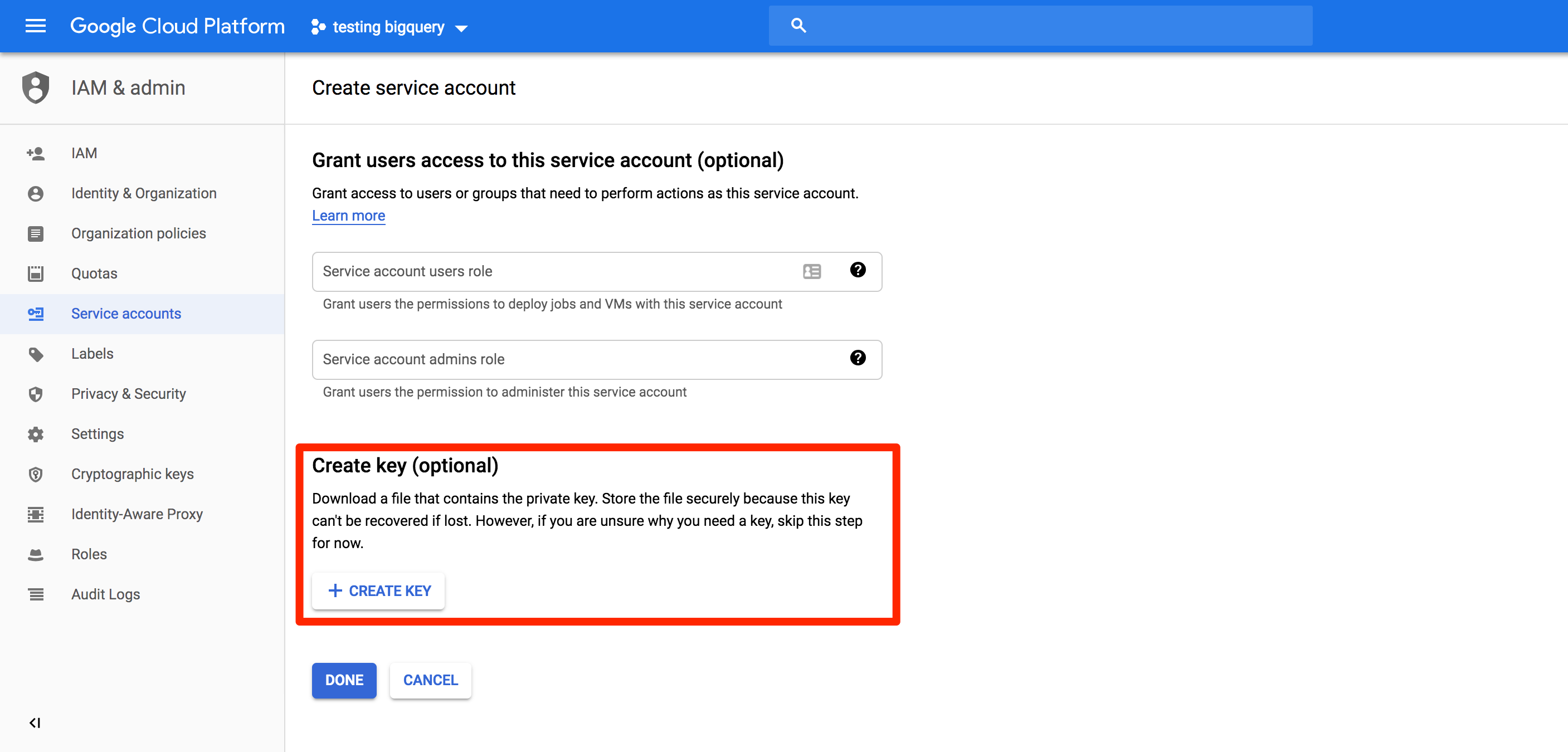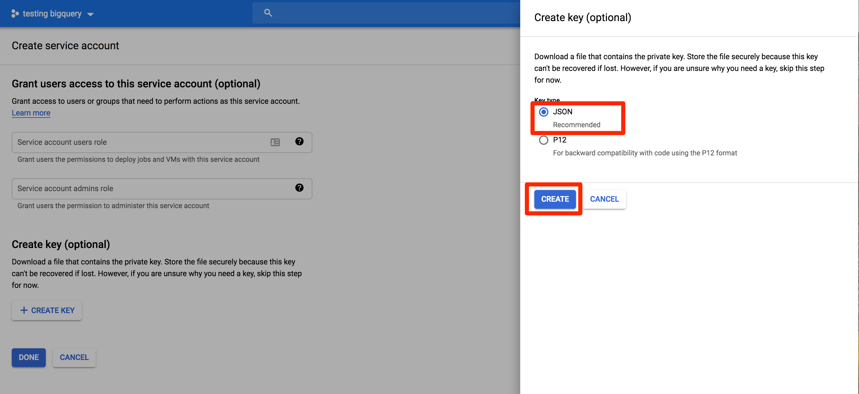 Now you can create a new BigQuery warehouse source, upload the JSON key you just downloaded, and complete the BigQuery setup