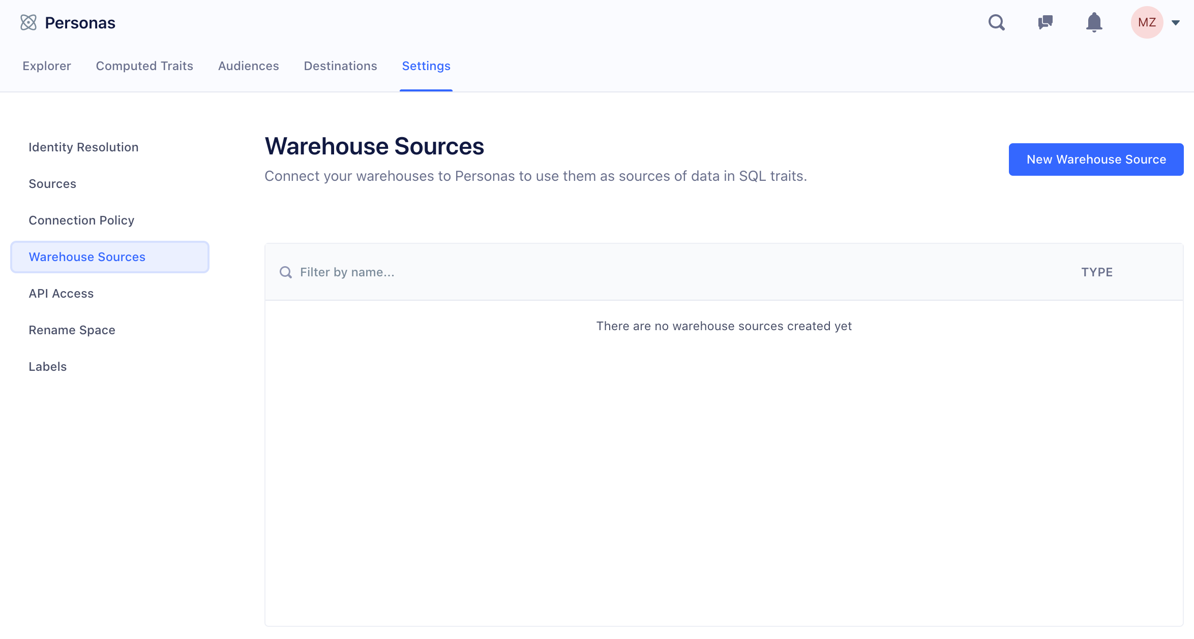 Navigate to the Personas settings (Personas > Settings tab > Warehouse Sources), and click New Warehouse Source.