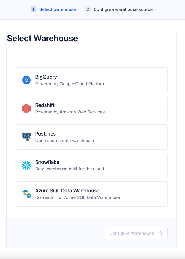 Select the type of warehouse you’re connecting.