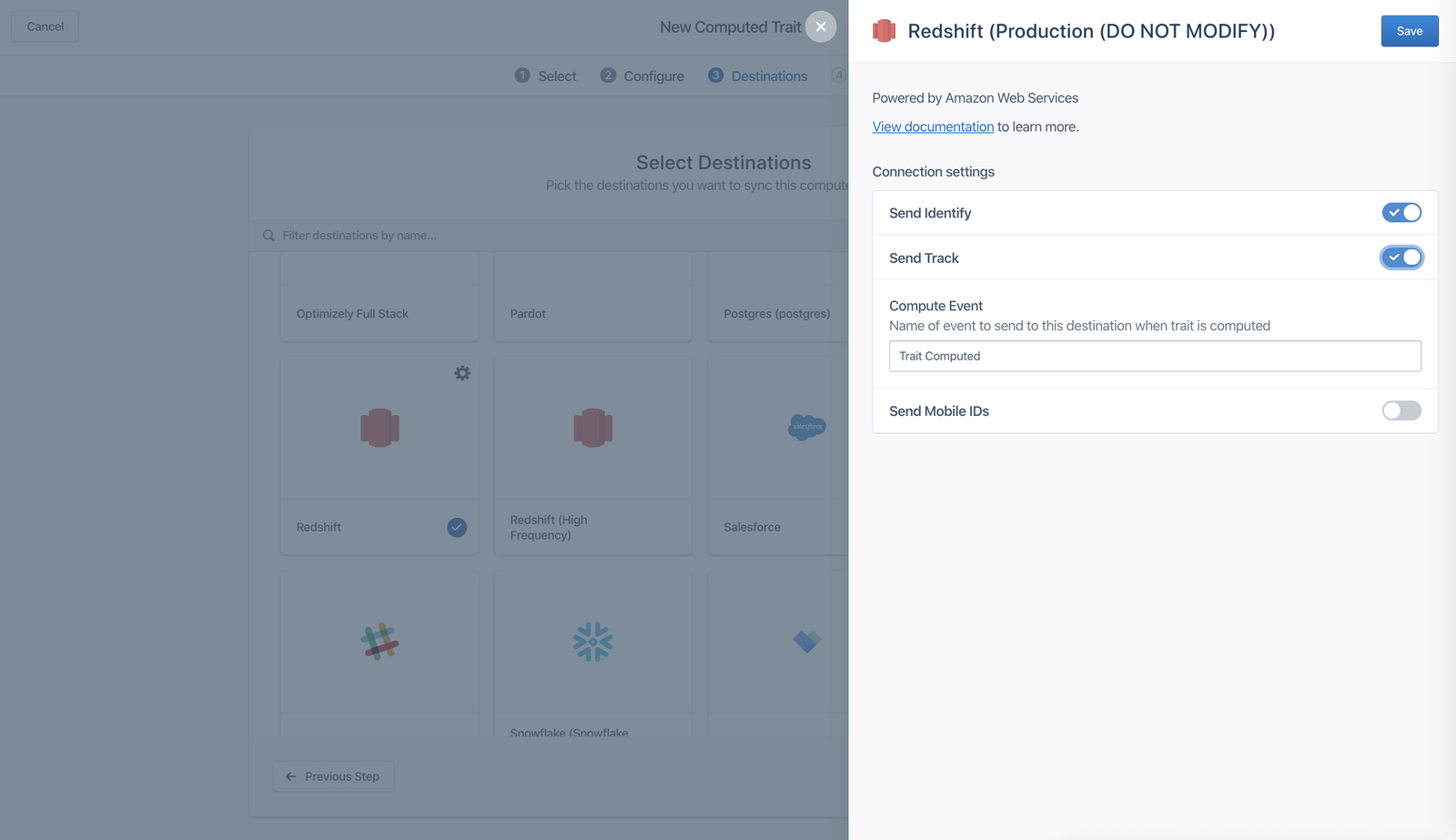 With Personas, you can send Computed Traits and Audiences to a data warehouse like Redshift, BigQuery, or Snowflake. This allows you to perform analysis and reporting around key customer audiences and campaigns, as well set up your user data as input into predictive models.