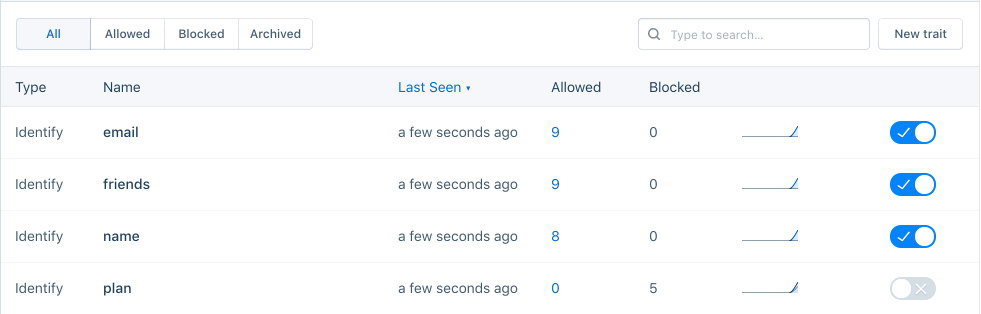 If you no longer want to capture specific traits within .identify() and .group() calls, you can either remove those traits from your code, or if you’re on the Business plan, you can block specific traits right from the Segment UI. To do so, click on the Schema tab in a Source and navigate to the Identify or Group events where you can block specific traits.