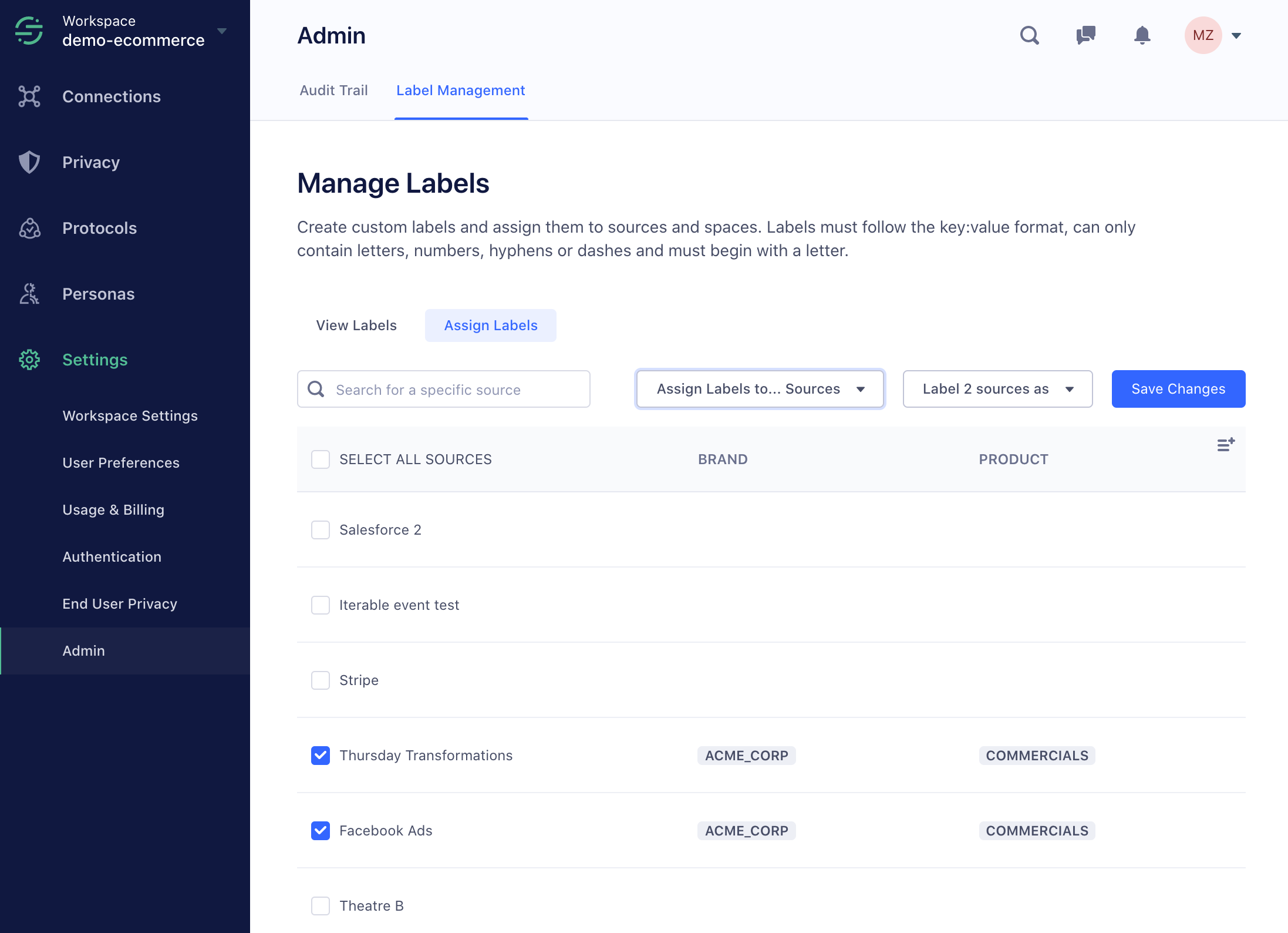 Workspace owners can assign bulk assign labels to sources and Personas spaces using the “Assign Labels” tab in the Labels screen. Source admins and Personas space admins can edit the labels on their individual resources in the “Settings” tab.